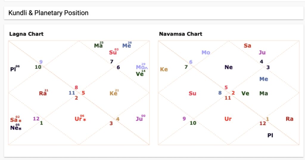 - Libra – Sun, Mars, Mercury, (12th house in above horoscope)